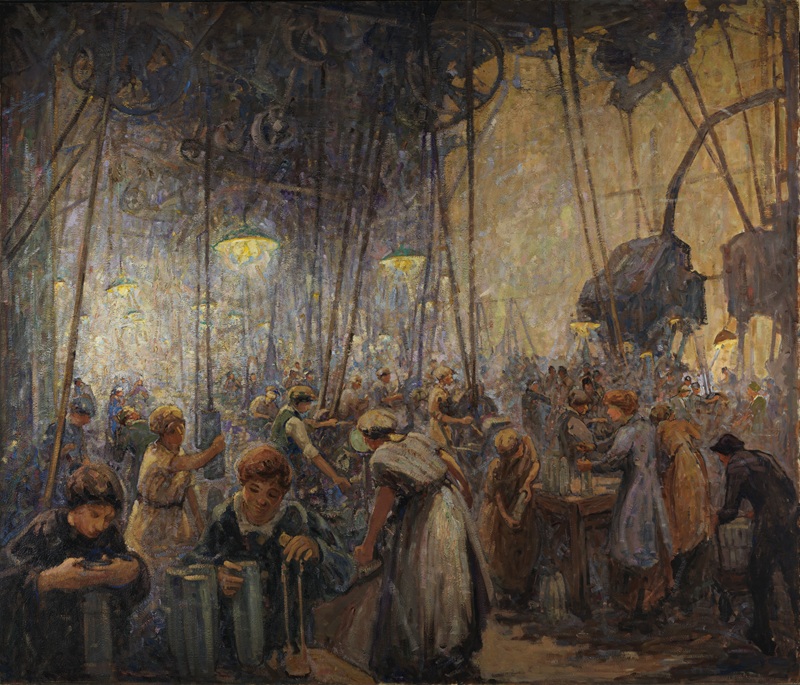 Painted by Mabel May in 1919. This painting captures what a female factory worker described as the avenues of clanking, grinding, clashing machines. Mabel May one of four women artists commissioned by the Canadian War Memorials Fund to depict female munitions workers. After visiting a factory in September 1918, May described her experiences as all desperately interesting. Montreal artist Mabel May used an impressionist technique to show women working in a munitions factory. The women in the painting were performing work of an untraditional nature.