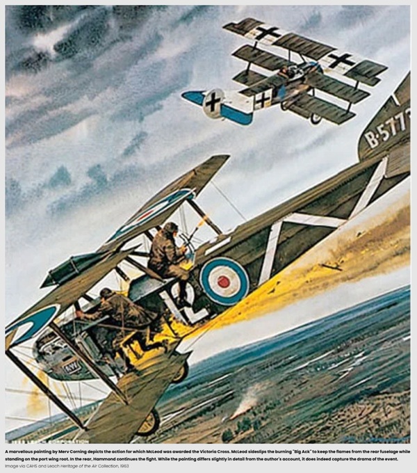 Lt Alan Arnett McLeod climbed out onto the wing and controlled the aircraft from the side of the fuselage with one leg inside the cockpit. By side-slipping steeply, he kept the flames to one side, allowing Hammond to continue firing. (In a side-slip, a plane moves sideways relative to the oncoming airflow.) Although Hammond could use only one arm, he somehow managed to fire at another German fighter as it closed in for the kill. The Fokker fell away. Hammond continued firing all the way to the ground.