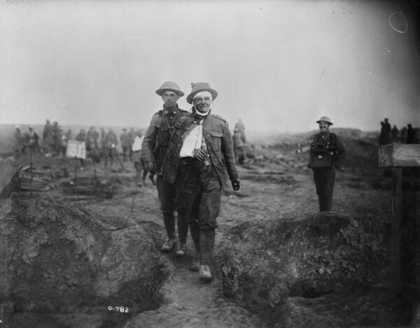 Cheerful though wounded. September, 1916. According to family sources, the wounded man is Private John Charles Morgan 53594 of the 18th Infantry Battalion. MIKAN No. 3395798