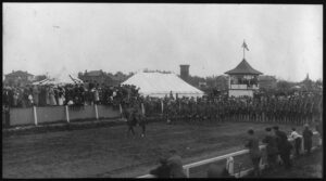 Dr. Kaiser & G.W. McLaughlin receiving the Salute from Col. Sam Sharpe’s 116th Ontario County Overseas Battalion, Oshawa, Ont. May 27th, 1916.