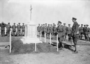 Gen. D. Watson who unveiled this Memorial reading the names of the fallen. September, 1917. This appears to be a service at a soldier’s plot for the 87th Canadian Infantry Battalion, showing an early memorial. Note the listing of soldier’s names on the near side of the memorial, who died of wounds during the Vimy Ridge operations of April, 1917. Maj. Gen. David Watson was the officer commanding the 4th Canadian Division, which the 87th Battalion was a unit of. MIKAN No. 3395022