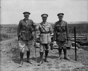 Col. Adamson and Lieut.-Col. Stewart, P.P.C.L.I. Battle of Passchendaele. November, 1917. Col. Agar Adamson, the Commanding Officer of the Princess Patricia’s Canadian Light Infantry, is likely in the center, with the officer on the right being Lt. Col. Charles James Townshend Stewart, the unit’s Commanding Officer in 1918. The officer on the far right is Lt Leonard Vivien Drummond-Hay,MC,MID,PPCLI. MIKAN No. 3397742